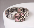 This Western Colored Turquoise Floral Cattle Tag Stretch Bracelet combines the vibrant beauty of turquoise with the rustic charm of silver-tone oxidized metal. The bracelet features a cattle tag-shaped ornament embellished with a delicate floral design, perfectly capturing the spirit of the frontier and southwestern charm. Ideal for cowgirls, ranch owners, and anyone who loves a touch of country glam, this bracelet is a stylish choice for everyday wear or special occasions like rodeos and western-themed parties.