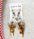 Bundle of feather earrings made with added turquoise chain. Top is wrapped in leather with a hoop to top off these unique statement earrings. Materials: genuine leather, kc gold faux turquoise chain, kc gold hammered hoop Size: Longest layer is aprox 4"