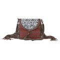 The bands of vivid red hues are interwoven to form the front of this bag. The rear sides have fringes and the zippered top keeps your belongings safe.